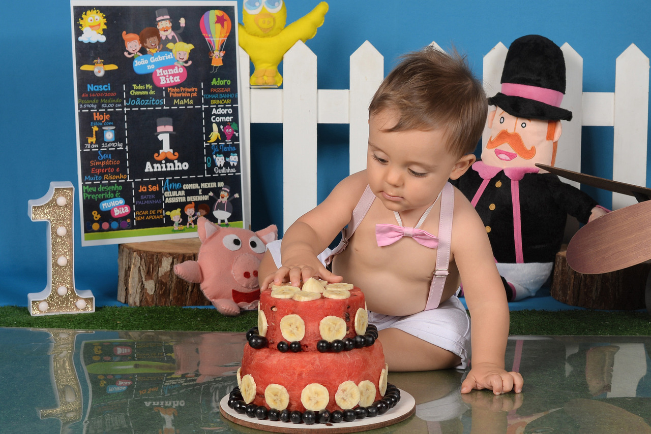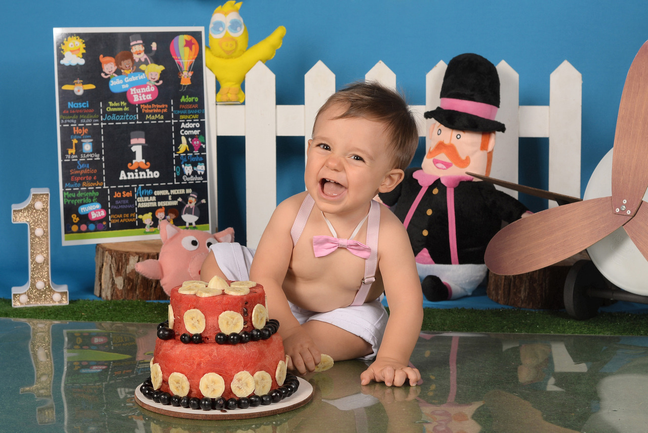 Para comemorar este primeiro ano muitas mães nos procuram para fazer o Smash the Cake e explicamos que temos diversas opções como o Smash the fruit com bolo de melancia ou frutas soltas e o ensaio sem bolo também.